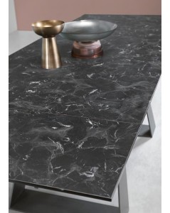 Table extensible avec cadre en métal peint et haut en verre anthracite, marbre anthracite ou en verre feuilleté effet marbre.